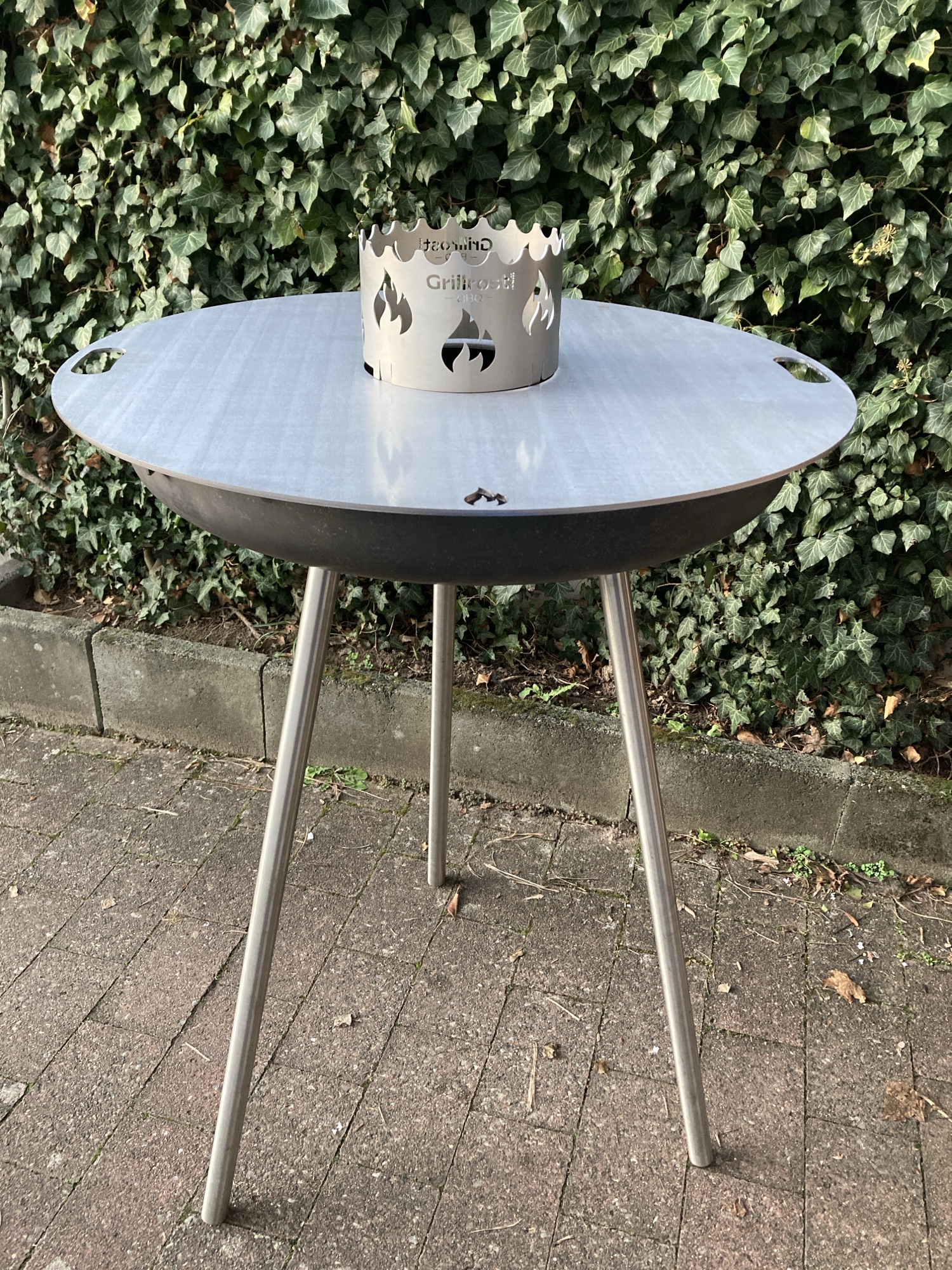 Im Endeffekt habe ich meine Plancha nun von meinem allerbesten Schatz und Finanzminister zu Weihnachten bekommen. Wichtig war die Größe von 80cm das sie zu meiner Feuerschale passt. Zudem waren noch Abstandshalter nötig, damit die Platte nicht auf der Schale aufliegt und Luft ans Feuer kommt.