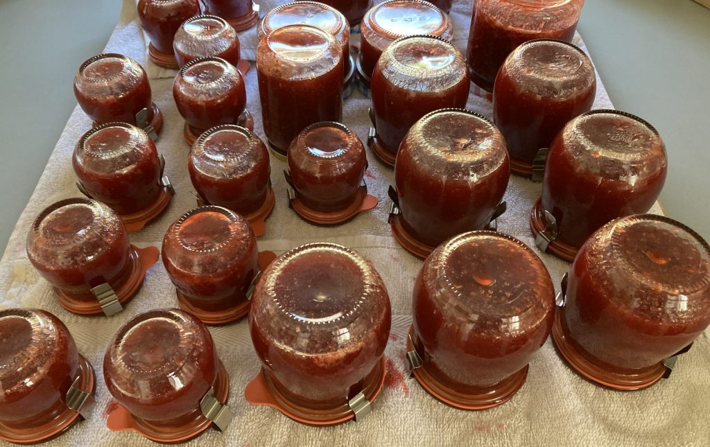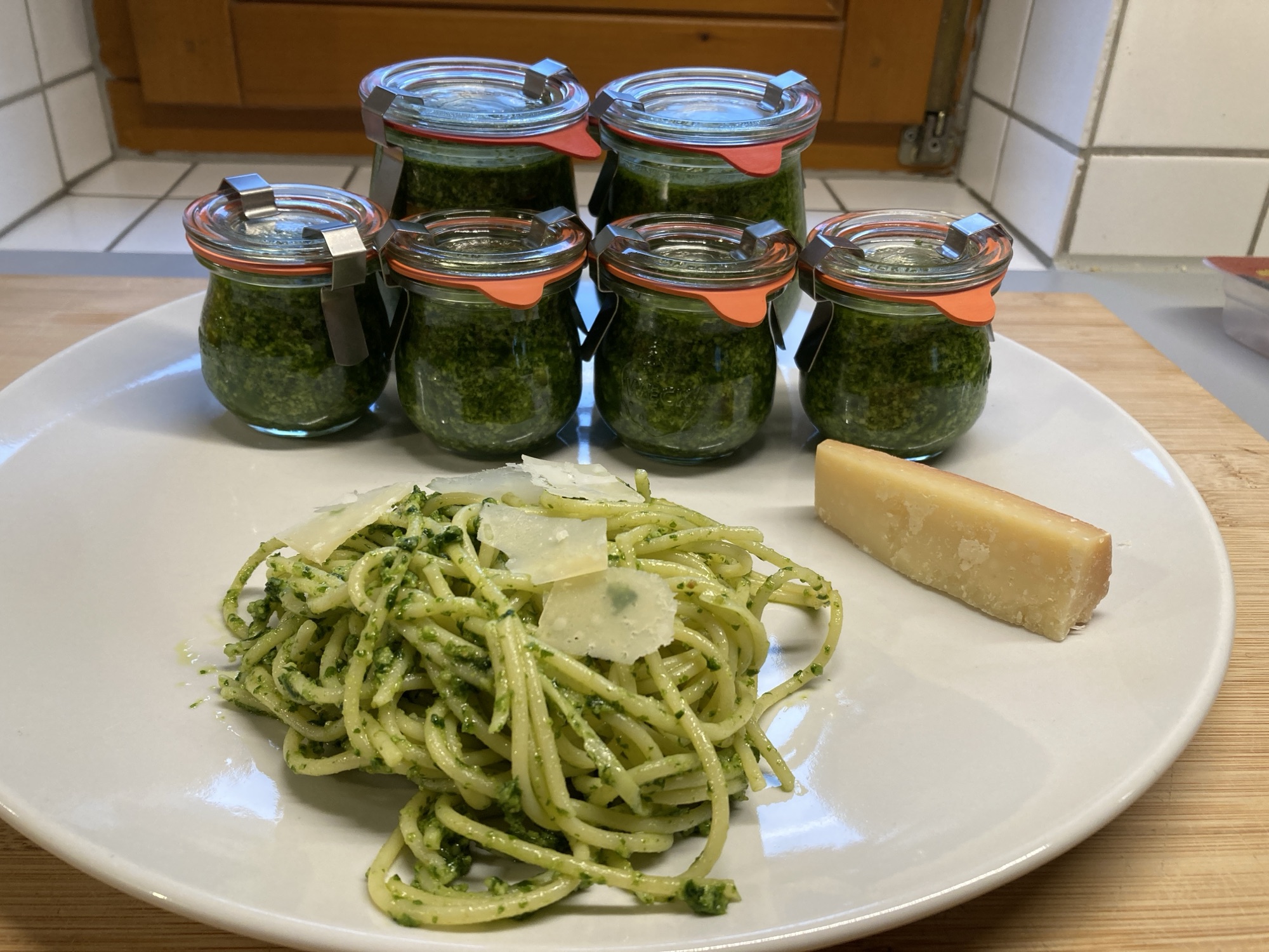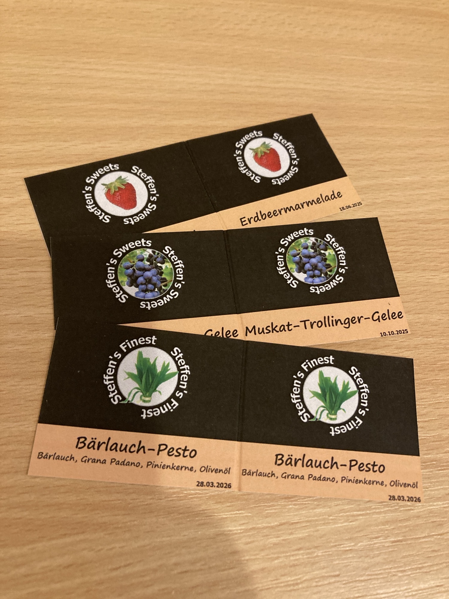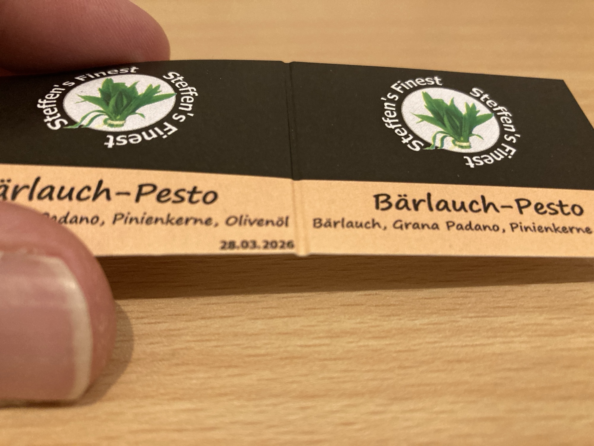 Also wollte ich eine Falzmaschine. Aus Mangel an Zeit, habe ich das verworfen. Später dann habe ich meine Williams Christ Birnen eingekocht, für die leckeren Willis im Winter. Habe Schildchen gedruckt. Wollte eine Falzmaschine, und habe es aus Mangel an Zeit verworfen. Im Oktober dann habe ich meine Weintrauben geerntet. Aus den Muskat-Trollinger Trauben habe ich dann Gelee gekocht und mein Sortiment an Delikatessen weiter aufgestockt. Hab Schildchen gedruckt, und was soll ich sagen… keine Zeit! Nun, vor ein paar Tagen habe ich wie jedes Jahr Steffen‘s Bärlauchpesto gemacht und abgefüllt.