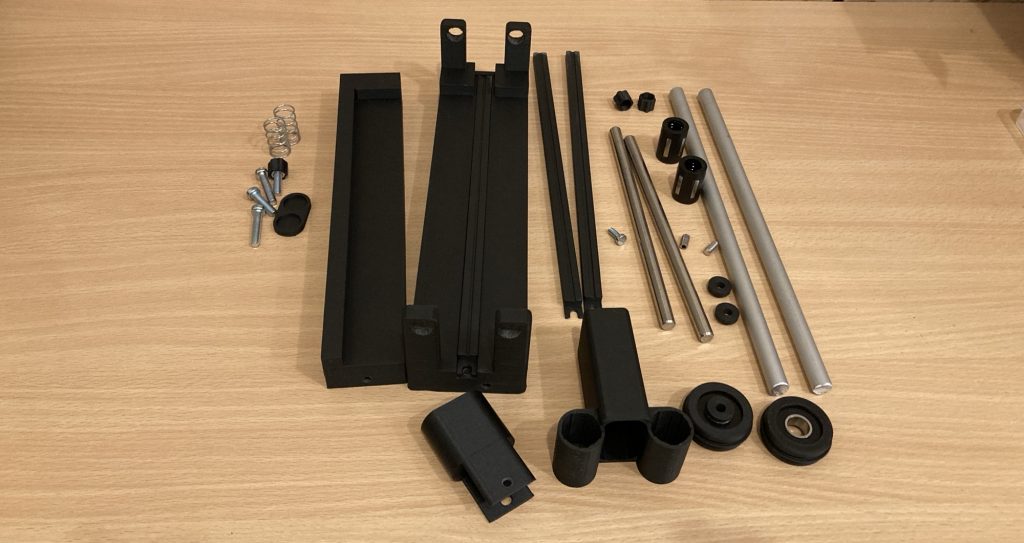 Zur Grundplatte kommt die einstellbare Falzrolle, Einsätze für verschiedene Papier/Karton Grammaturen beziehungsweise zunächst zum experimentieren was die optimalen Maße sind, und ein einstellbarer Anschlag. Mit dem Druck der nötig ist um das Papier zu Verformen habe ich mir etwas schwer getan. Über die 70 Newton die dafür angeblich nötig sind musste ich mich zunächst mal mit der KI auseinandersetzen. Laut Gemini hält ein 3D Gedrucktes Teil in der von mir gewählten Form die 7 kg Druck nicht aus ohne sich selbst zu verformen. Um später den passenden Anpressdruck in der Falzmaschine einstellen zu können, habe ich zunächst die Federn auf einer Küchenwaage mit 7 kg belastet und gemessen wie weit sich diese dabei zusammendrücken. Danach habe ich die Teile zusammengebaut.