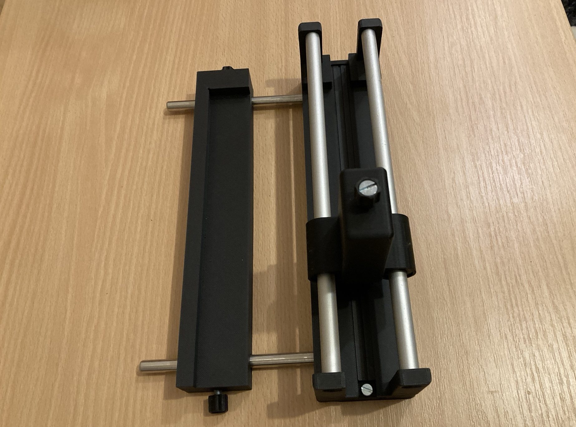 Und da man eine Falzmaschine wie die Vergangenheit zeigt immer mal braucht, habe ich mich daran gemacht, eine zu bauen. Nachdem ich herausgefunden habe, wie das Grundprinzip funktioniert, habe ich mit der Konstruktion angefangen. Ich hab mir gedacht, ich baue das Teil wie eine Fliesenschneidmaschine. Also erst mal ein Kugellager und zwei Linearkugellager zusammengesucht, dazu ein paar Rundstäbe aus eloxiertem Alu und Edelstahl, ein paar Federn, Schrauben etcpp. Der Rest kommt aus dem 3D Drucker.