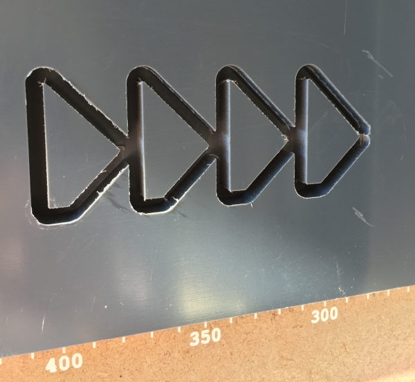 Eine 12er Hart-PVC Platte in die Fräse gelegt, und los geht’s.