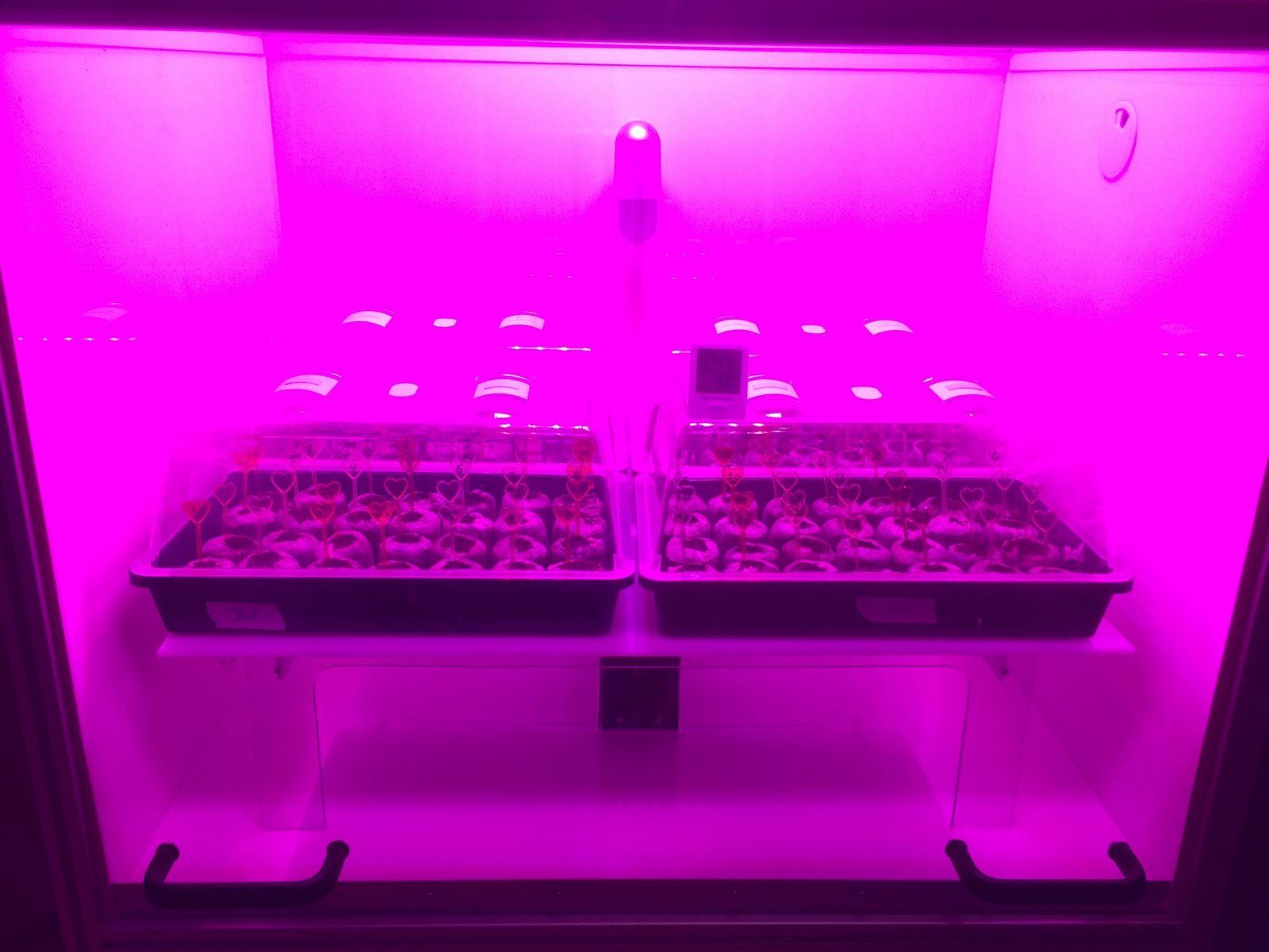 Die fertige Growbox zieht nun in einen anderen Raum um, und es kann losgehen. Intensität 25% Licht, sonst verbrennen die jungen Pflanzen. 8 Stunden Sonne am Tag sind ideal. Folgend noch ein paar Fotos der ersten Anzucht.