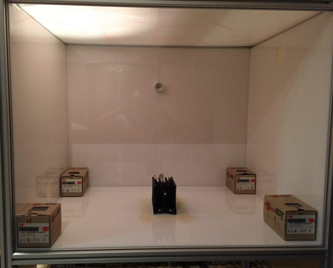 Die innere Verkleidung ist angebracht und mit Silikon auf die Hartschaumplatten geklebt. Als Heizung dient eine Schaltschrankheizung aus der Kruschkiste die von mir modifiziert wurde, um die elektrischen Komponenten vor Feuchtigkeit zu schützen. Diese ist mittig angebracht und die Kühlrippen passend ausgerichtet. In der Rückwandplatte sind 2 Temperatursensoren angebracht. Einer für die Temperaturregelung der Box, und einer um die Growbox in meine Home-Automation einzubinden, damit ich die Werte Temperatur und Luftfeuchte und deren Verlauf in meinem Browser anschauen kann. Desweiteren sind Buchsen für einen Umwelzlüfter in der Rückseite integriert. Links unten und rechts oben sind zwei einstellbare Luft Ein- und Auslässe, um den kontinuierlichen Luftaustauch einstellen zu können.