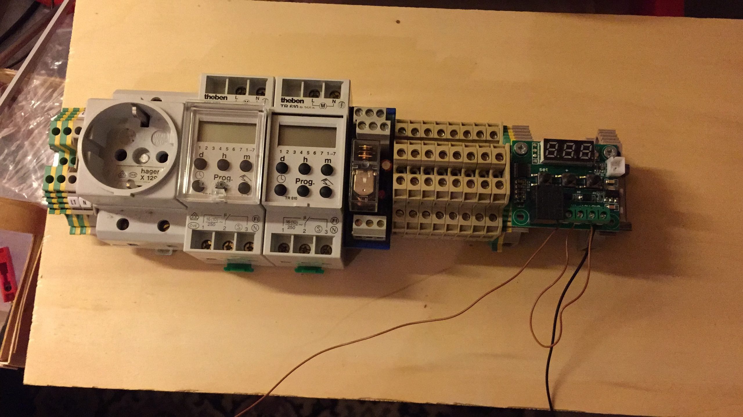 Unter die Box kommt ein kleiner Kasten mit Zwei Zeitschaltrelais sowie dem Temperaturregler. Lampe sowie Heizung mit Lüfter sind Programmierbar auf Zeit und Temperatur.