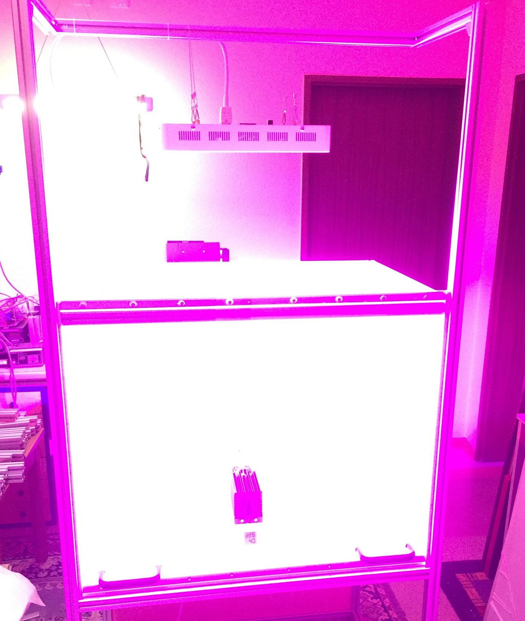 Noch die vordere Schiebetüre einbauen, und die 50 Watt Vollspektrum LED Pflanzenlampe aufhängen, und dann geht es an die Steuerung. Ein Gestell für die Luftzirkulation und ein unabhängiges Thermometer muss noch reingestellt werden.
