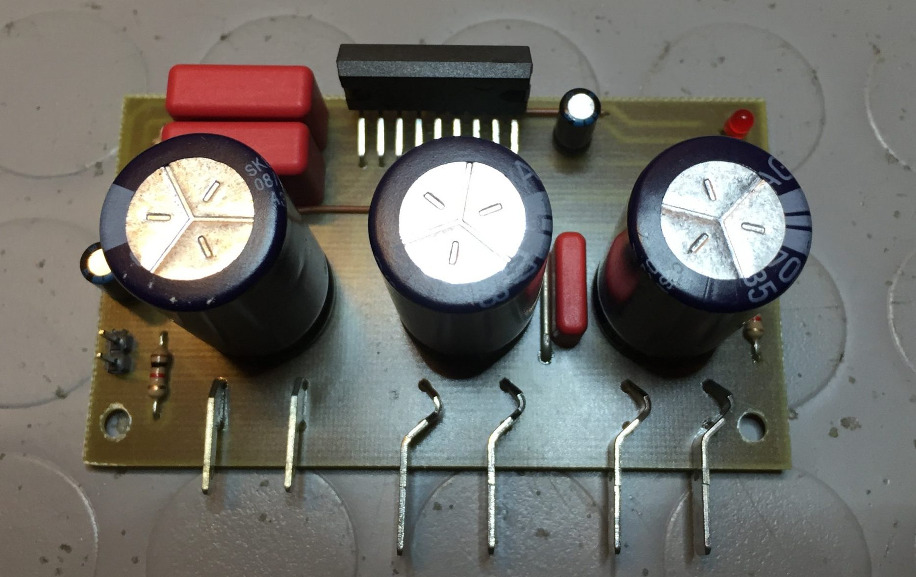 Als Mischer für die beiden Tonquellen und als Vorstufe bzw. die Lautstärkeregelung dient eine alte Platine auf Basis von Operationsverstärkern vom Typ LM358. Diese hatte ich beim Bau eines Mischpults als Testplatine verwendet.