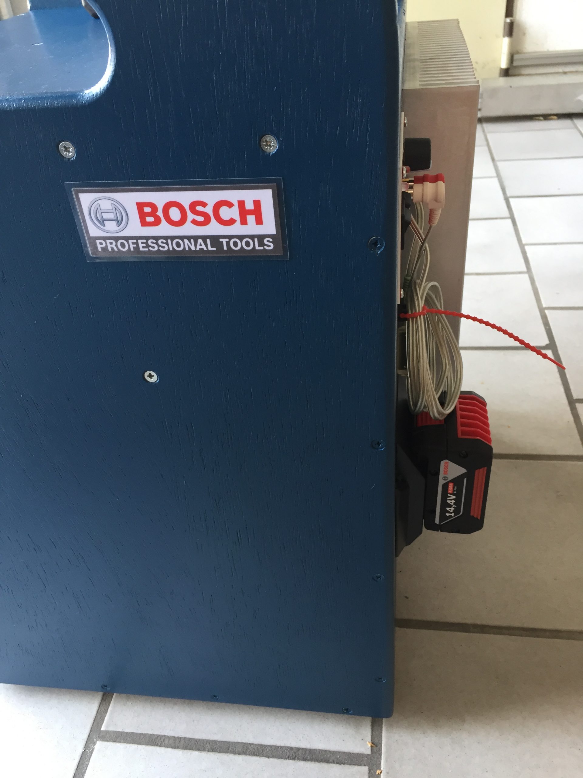 Ein Ersatzladegerät und zwei Ersatz-Akkus von einem Bosch Akkuschrauber müssen herhalten. Zudem ein Kühlkörperchen sowie ein Line/Bluetooth Wandler aus der Kruschkiste.