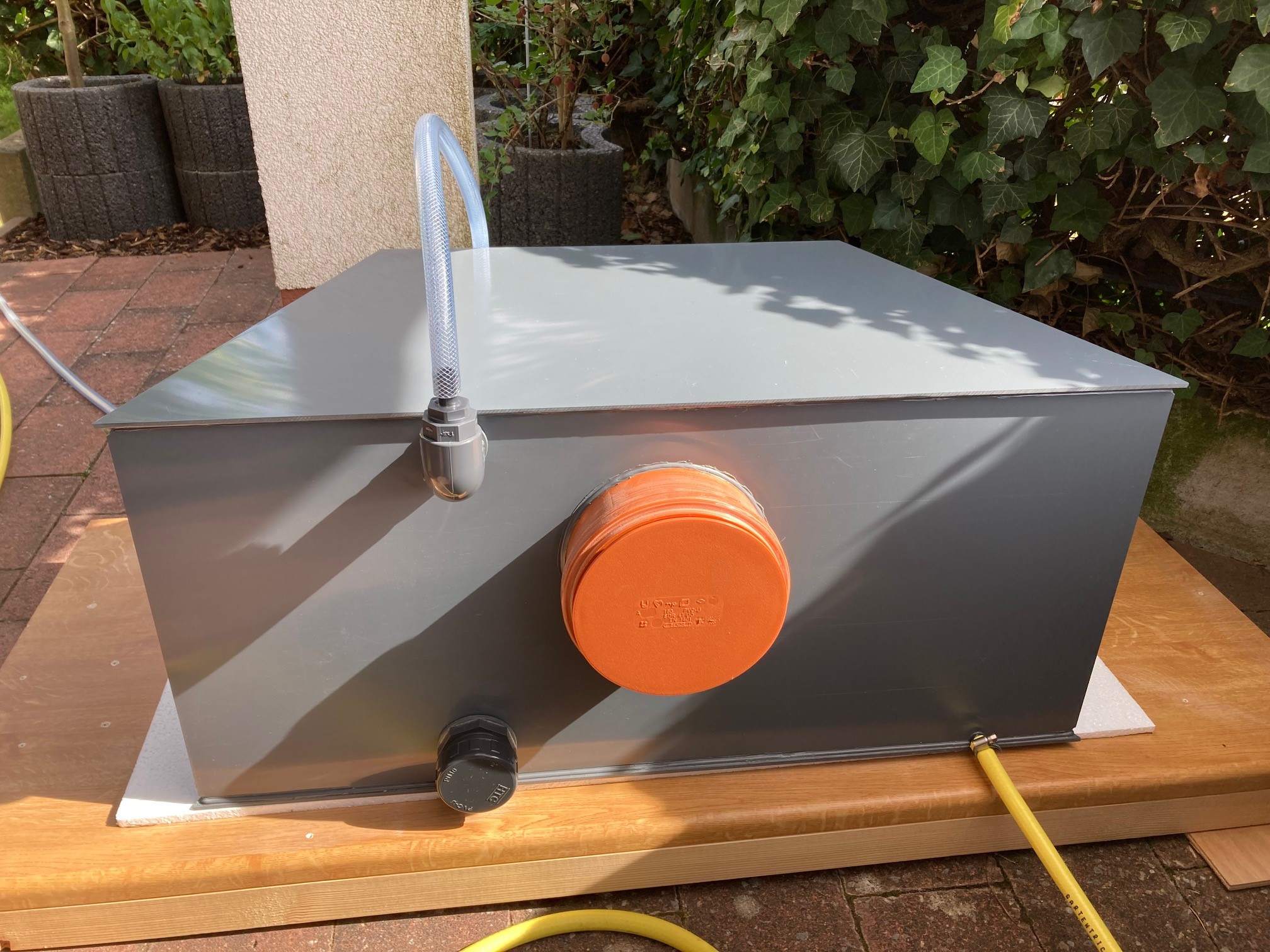Füllstandsindikator, Notüberlauf, Anschluss für die Venturidüse. Alle Rohrverschraubungen fest verschrauben, und die Tanks mit Wasser befüllen, und zum prüfen an allen Verbindungsstellen für einen Tag Löschpapier unterlegen. Zum Glück war der Bereich der Tanks dicht.