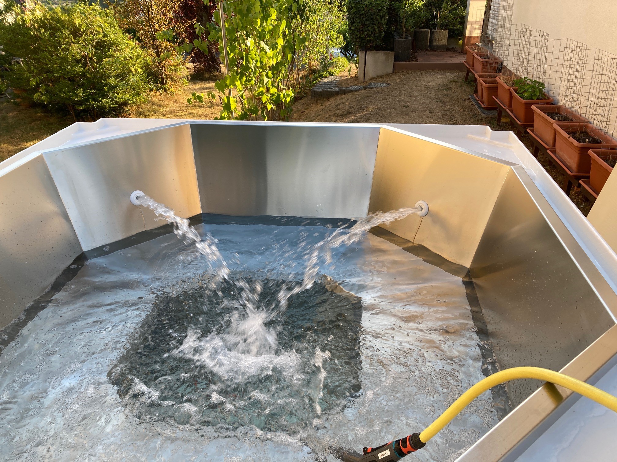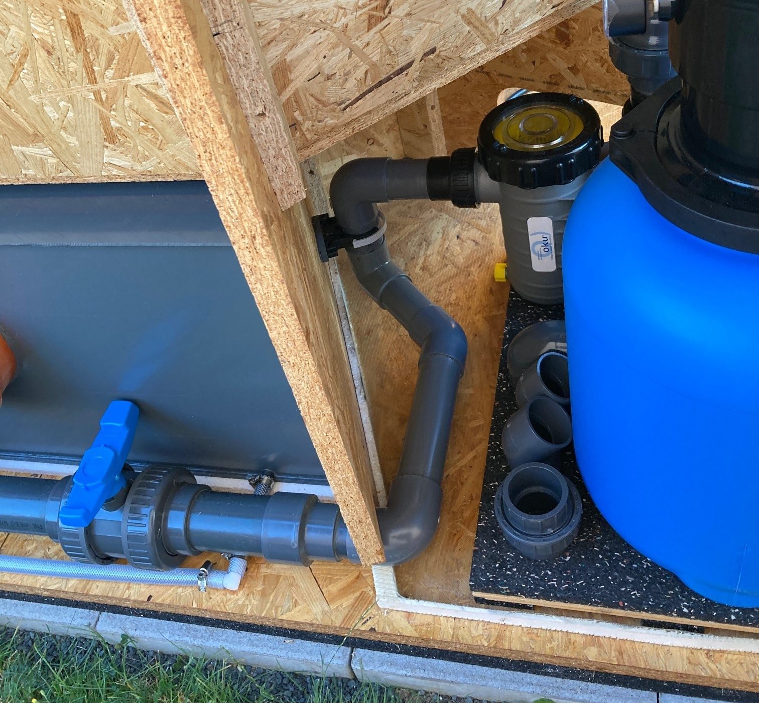 Nun nach und nach die einzelnen Segmente mit Wasser befüllen und auf Dichtigkeit prüfen. In Summe gab es zwei undichte Stellen. Eine Schlauchverbindung an der Massagedüse, und der Ablass-Stopfen am Sandfilter. Um die Stelle am Sandfilter zu finden, musste ich 3 Tage suchen.