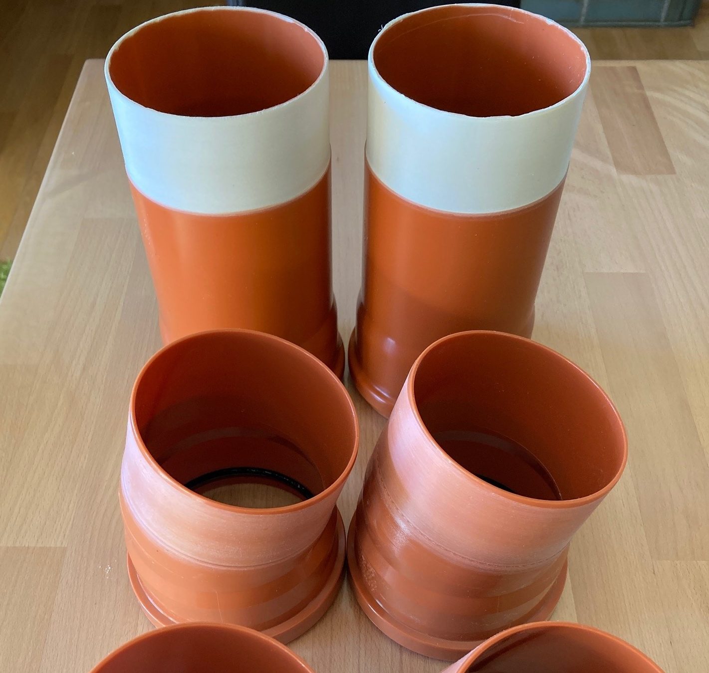 Danach hat mir der Herr der mechanischen Fertigung wieder einen Knüppel zwischen die Beine geworfen. Die Dichtungen der PG-Rohre sind keine O-Ringe mehr sondern haben eine Dichtlippe. Dick mit Vaseline eingeschmiert dachte ich mir, gehen die dauerhaft gut zu verschieben. So ist das leider nicht. Einmal drauf und kurz gewartet, und rum ist es mit dem verschieben. Um meine Verbindung zwischen Ablaufrinne und Tanks herzustellen, müssen die äußeren Bögen aber zunächst komplett aufgeschoben werden damit des Verbindungsrohr eingesetzt werden kann. Dann müssen die Bögen über das Verbindungsrohr geschoben werden. Da ist nichts mehr mit verschieben. Nach dem Zerlegen der PG-Rohre mittels Bandschlüssel (zum Glück hat alles gehalten) habe ich die Rohre um einen mm abgedreht. Dafür war auch wieder eine Spezialkonstruktion nötig um die 110er Rohre und Bögen rund zu spannen.