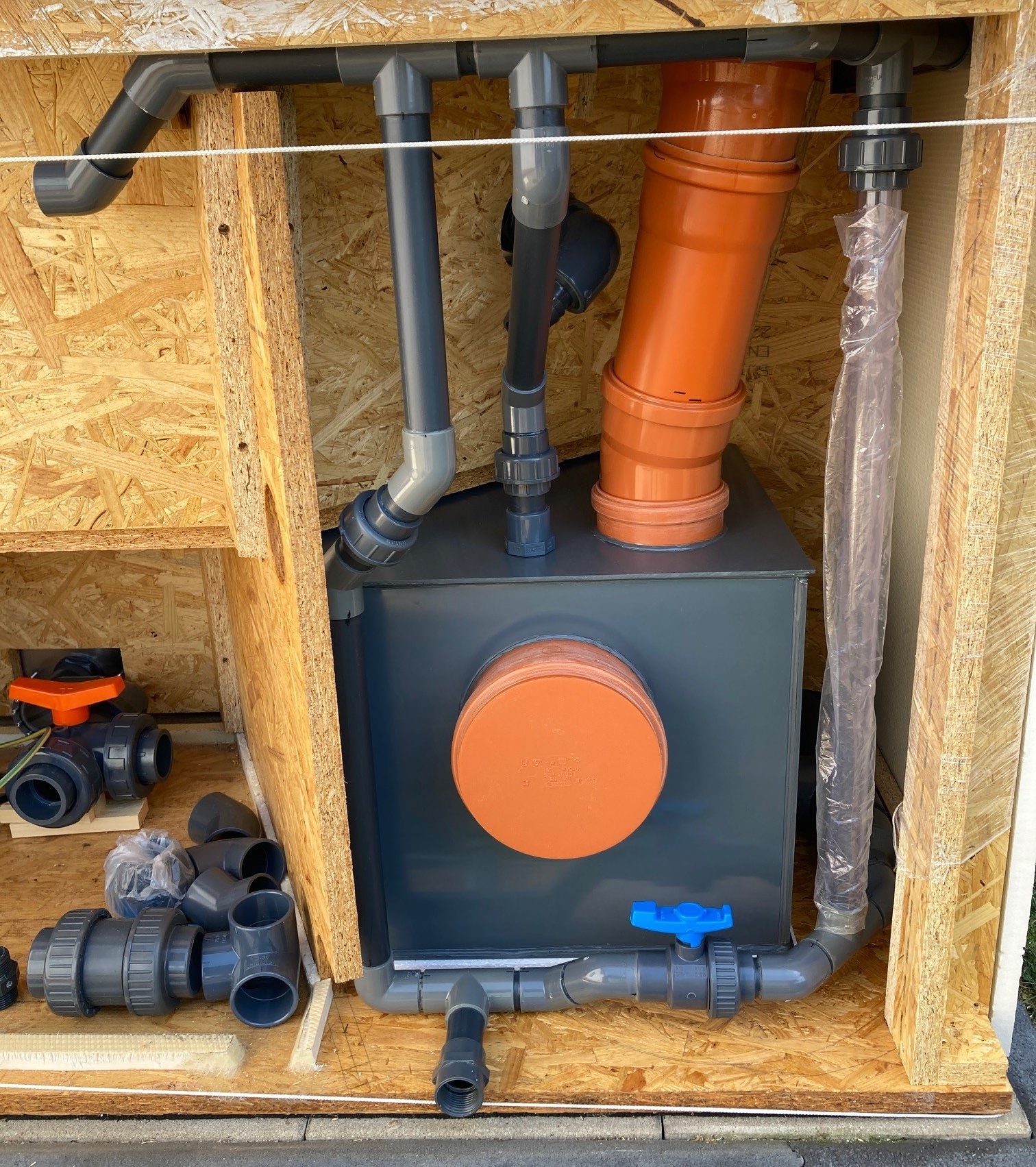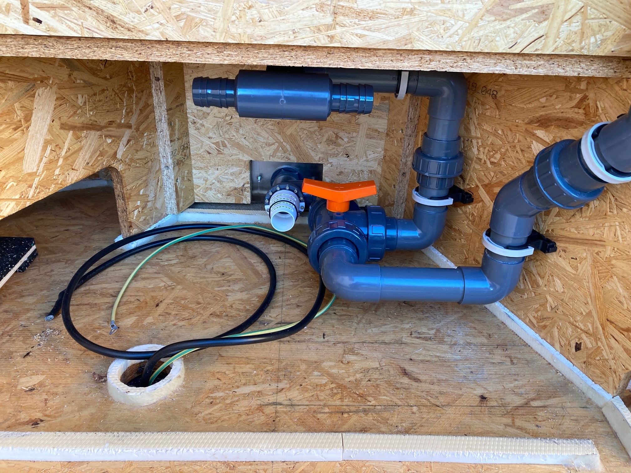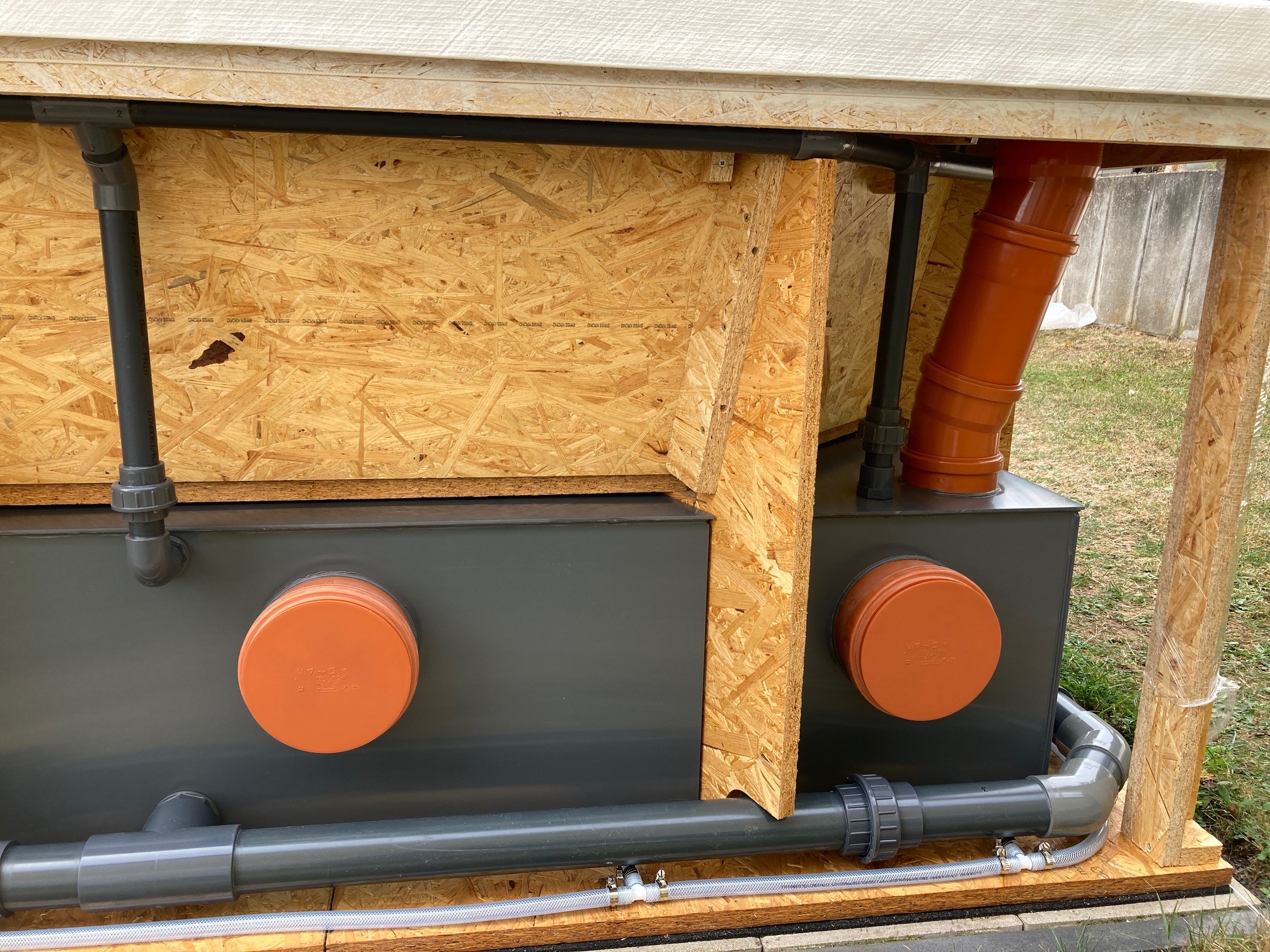 Wie im vorhergehenden Artikel in Teilen zu sehen, habe ich die Einfassung der Wanne mit OSB Platten abgeschlossen. Die Wanne liegt nun überall großflächig auf einer Korkmatte auf. Nach den Tests der Tanks habe ich die 63mm T-Stücke mit Teflonband auf die Verschraubungen der Tanks geschraubt. Dann ging es mit den 63er Rohren weiter, welche die Tanks für die Wasserführung untereinander verbinden.