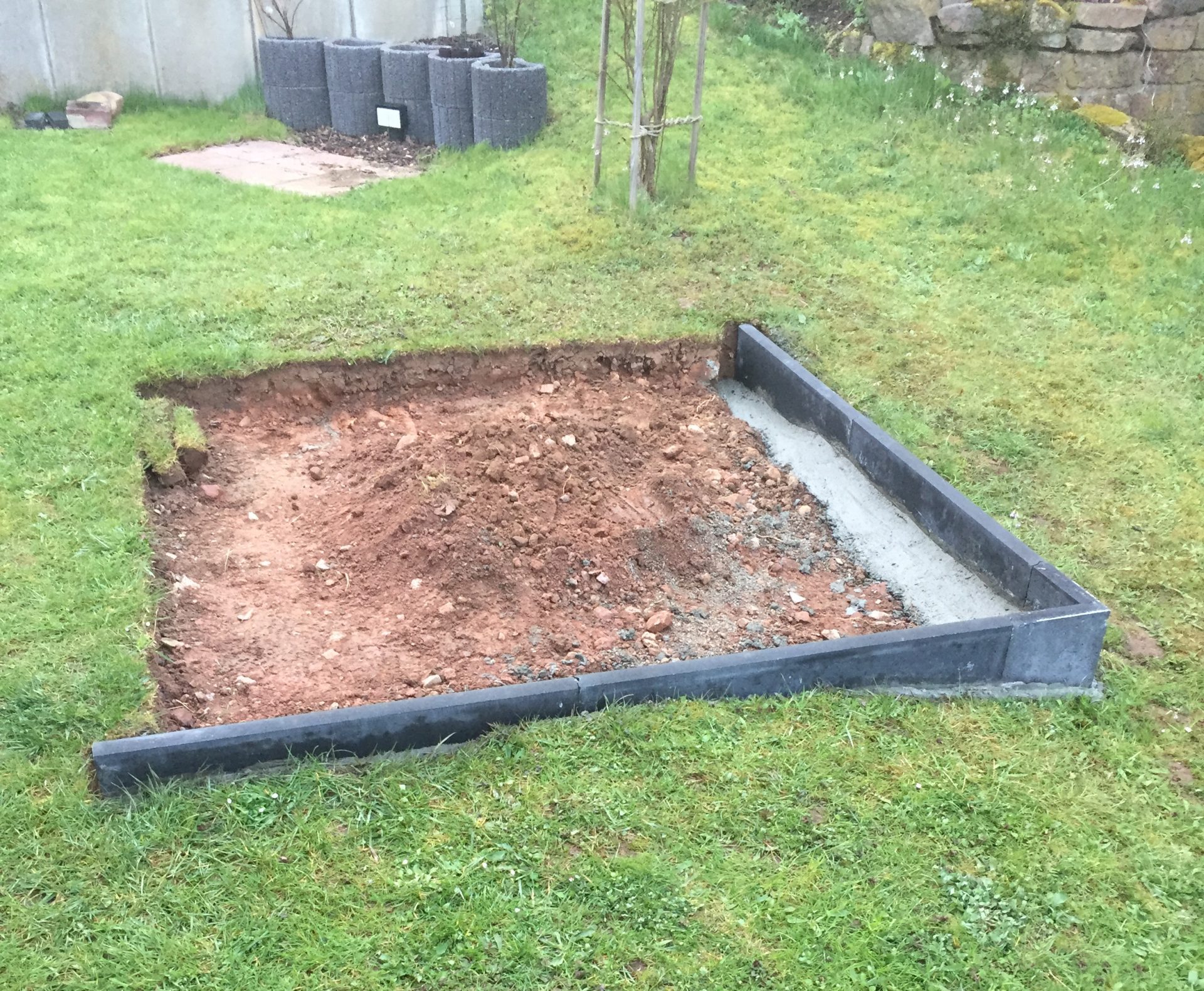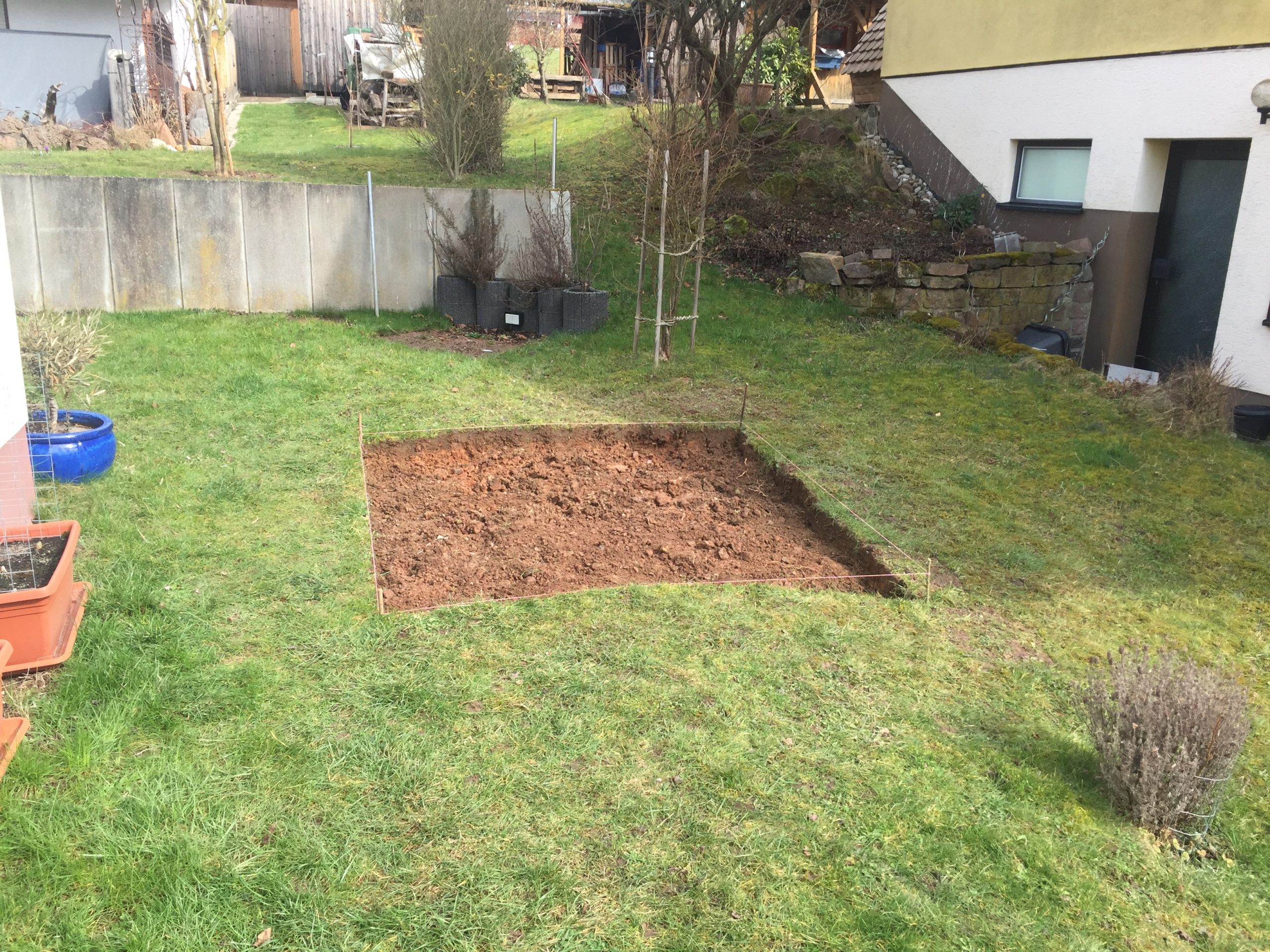 Die Zeichnung war fertig, die Wanne bestellt, also ging es an die vorarbeiten. Zunächst im Garten den Platz an dem der Pool stehen soll ausgraben.