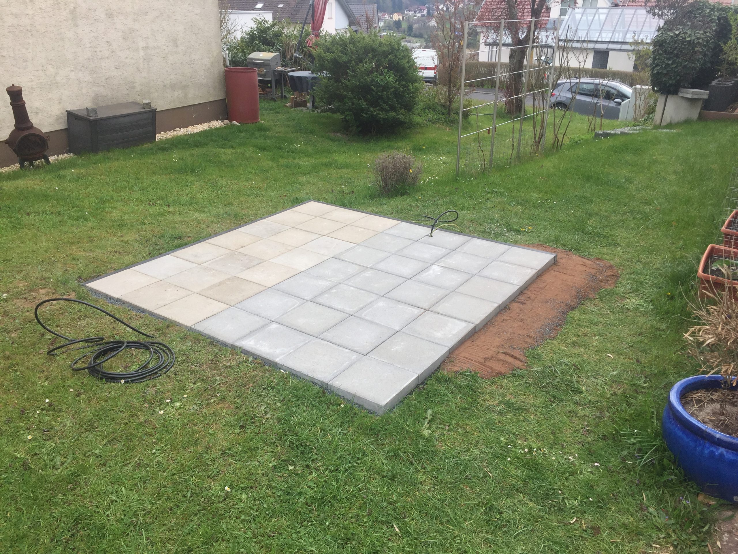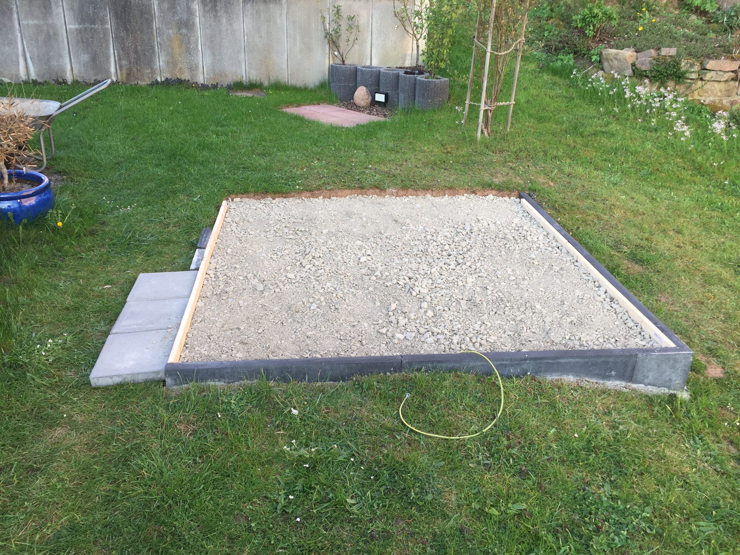 Mit Basaltsplitt abziehen, und das ganze mit noch vorhandenen Betonplatten belegen.