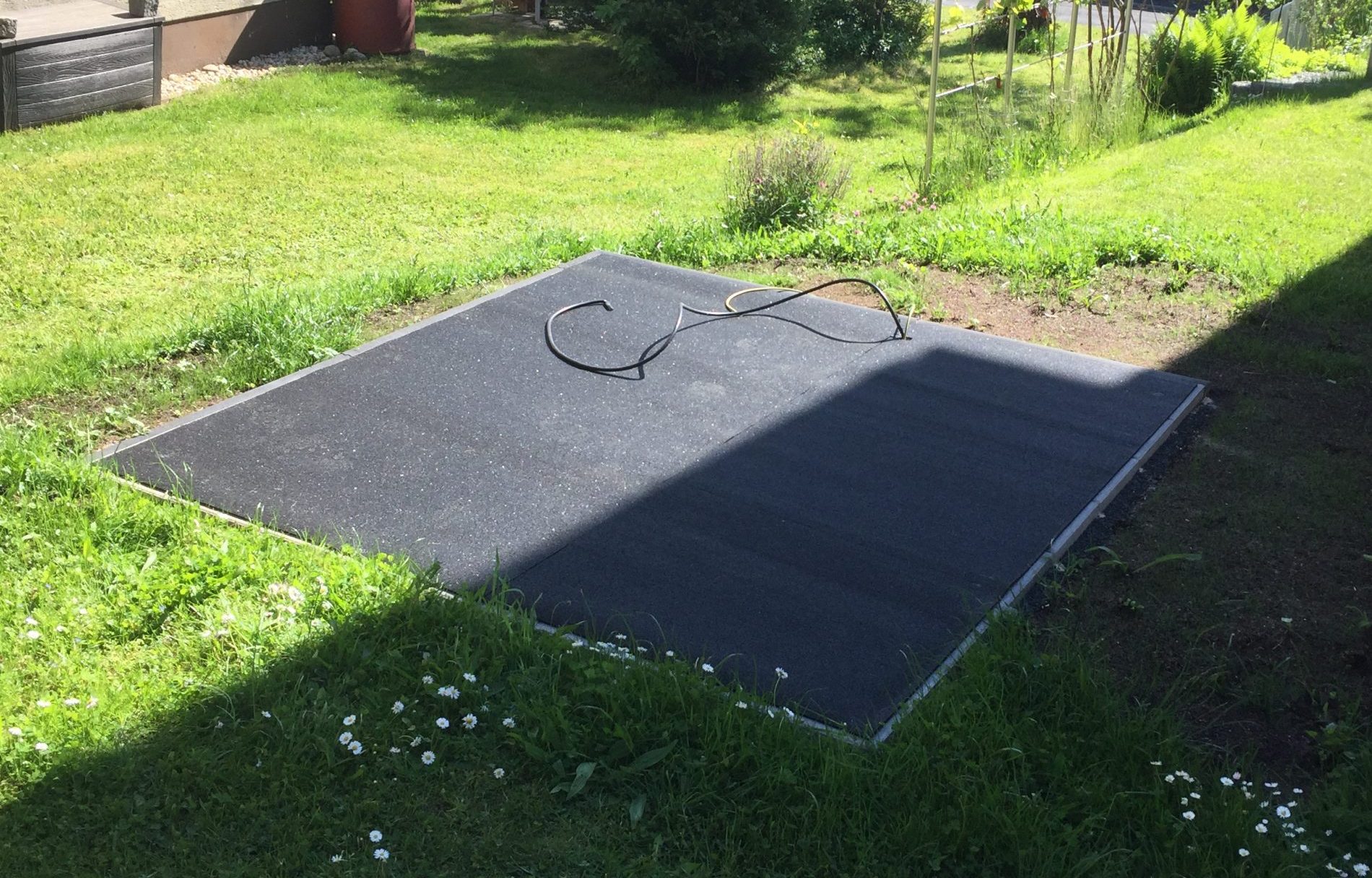 Dann noch eine Bautenschutzmatte drauf, um kleinere Unebenheiten auszugleichen und die Konstruktion vor Feuchtigkeit zu schützen.