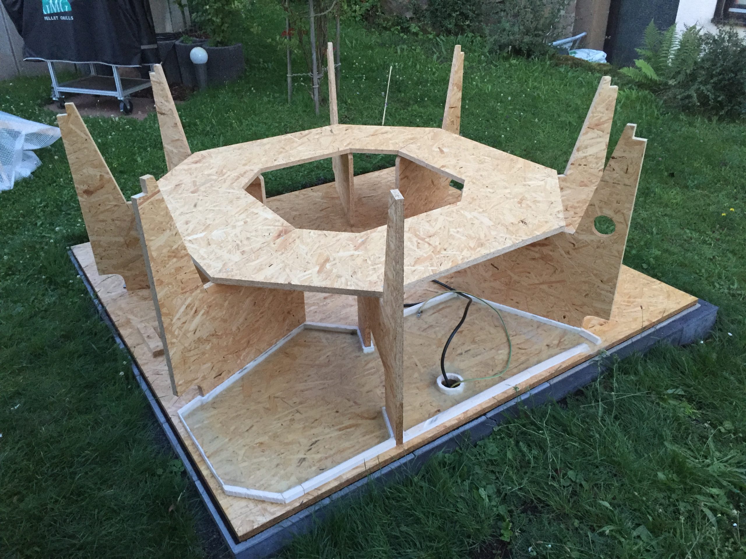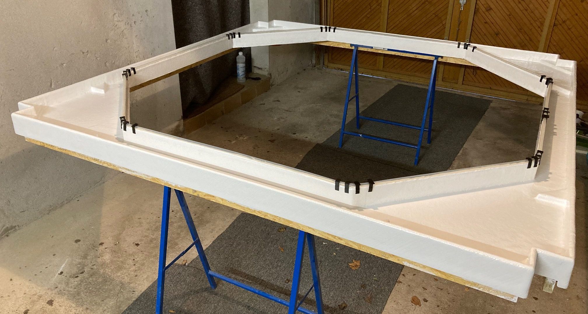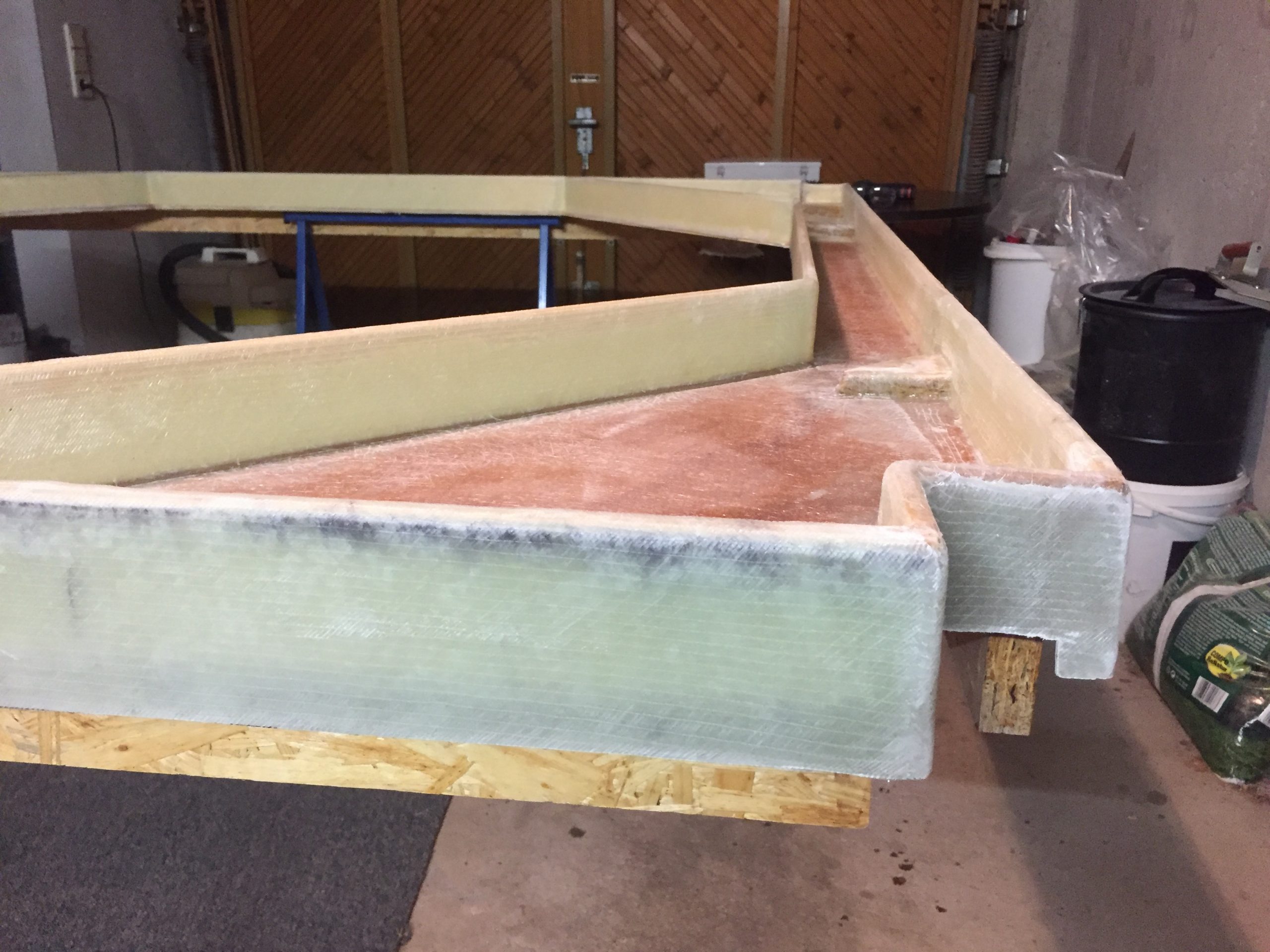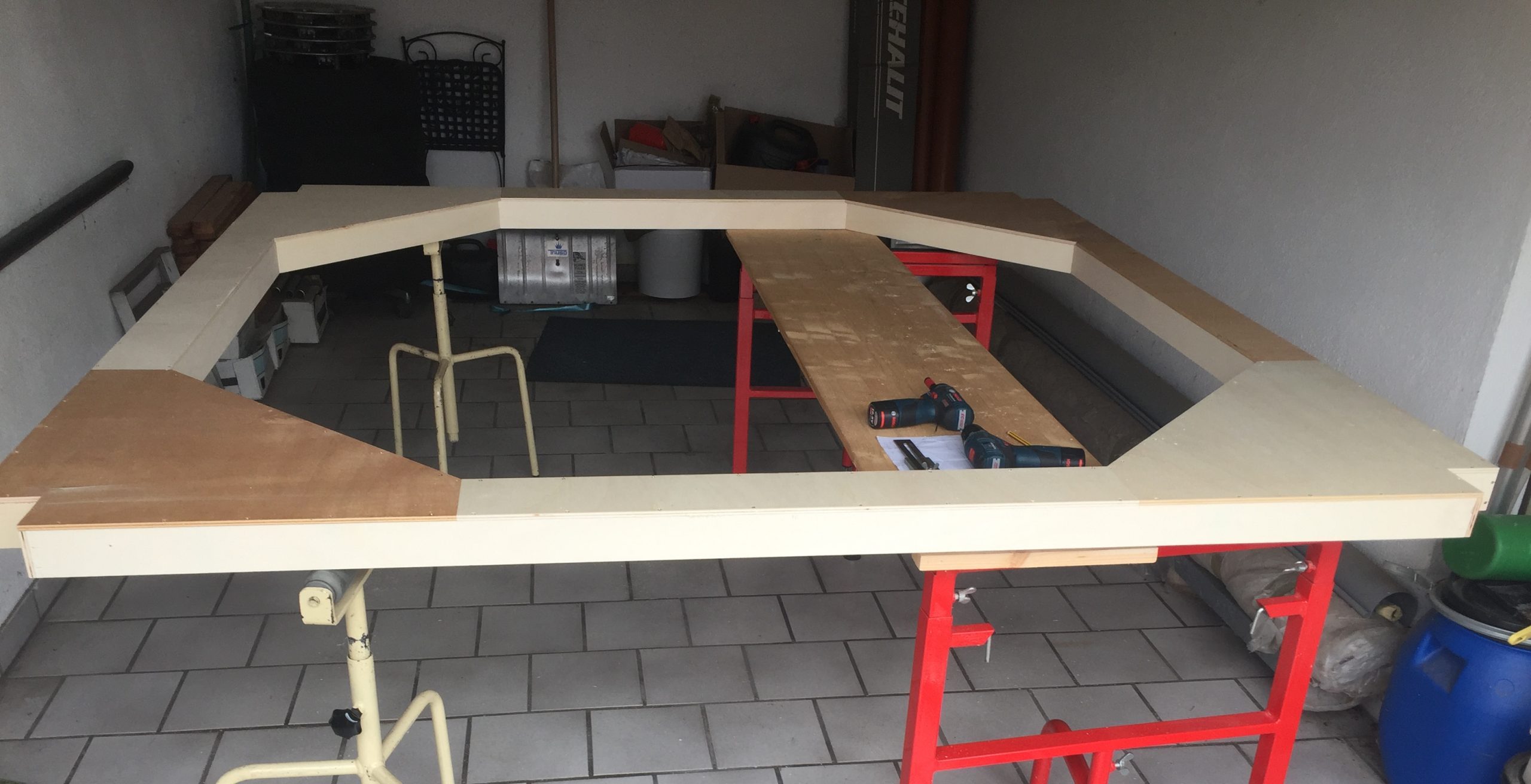 Seit geraumer Zeit ist die Garage wieder belegt. Ich habe mit der Überlaufwanne aus 10mm Sperrholz angefangen. Da der Whirlpool als Infinity-Pool entstehen soll, ist auch das eine Herausforderung. Wenn man drin sitzt, soll die Wasseroberfläche auch die höchste zu sehende Kante sein. Die Innenseite soll zur Wanne hin abdichten.