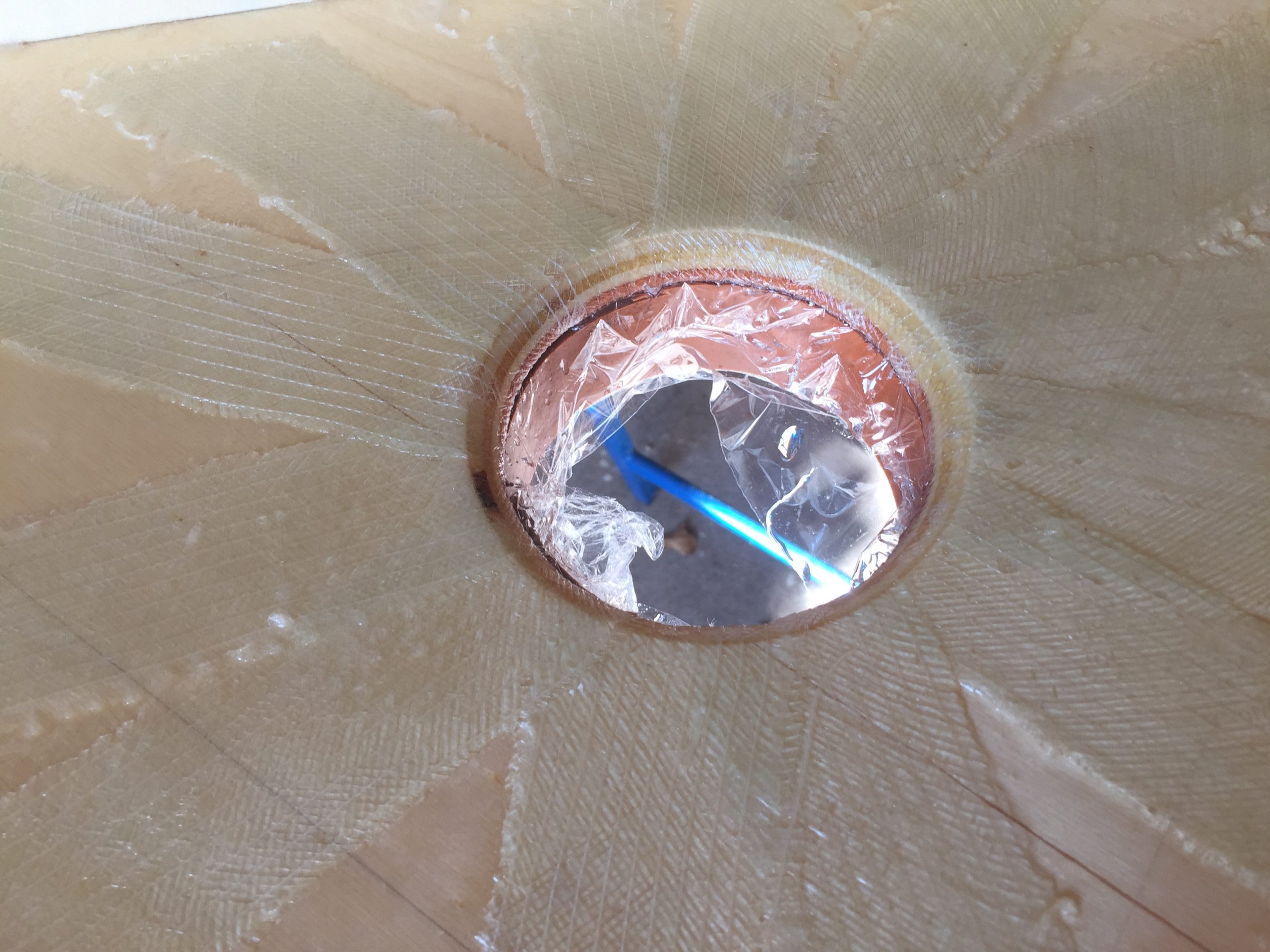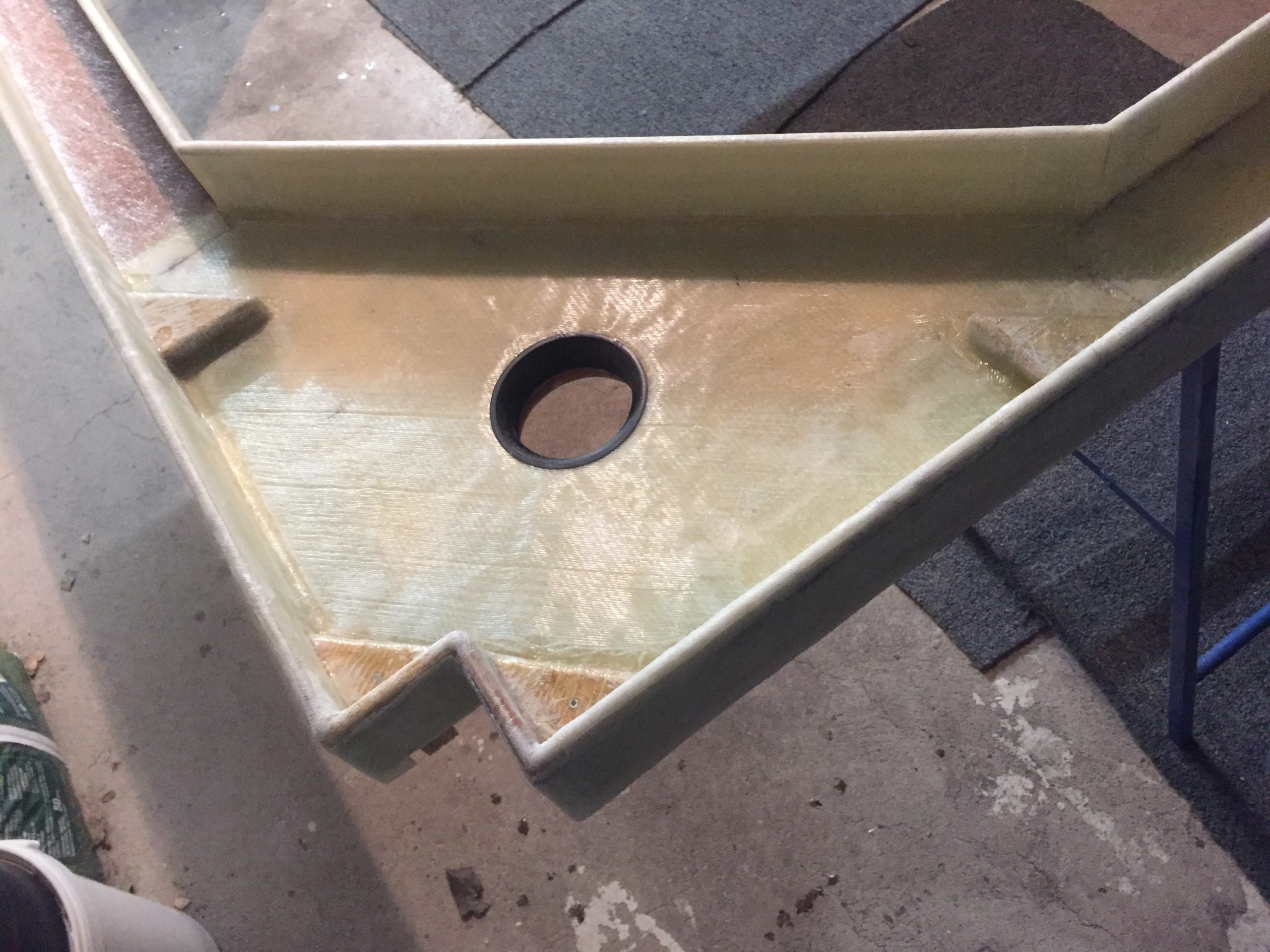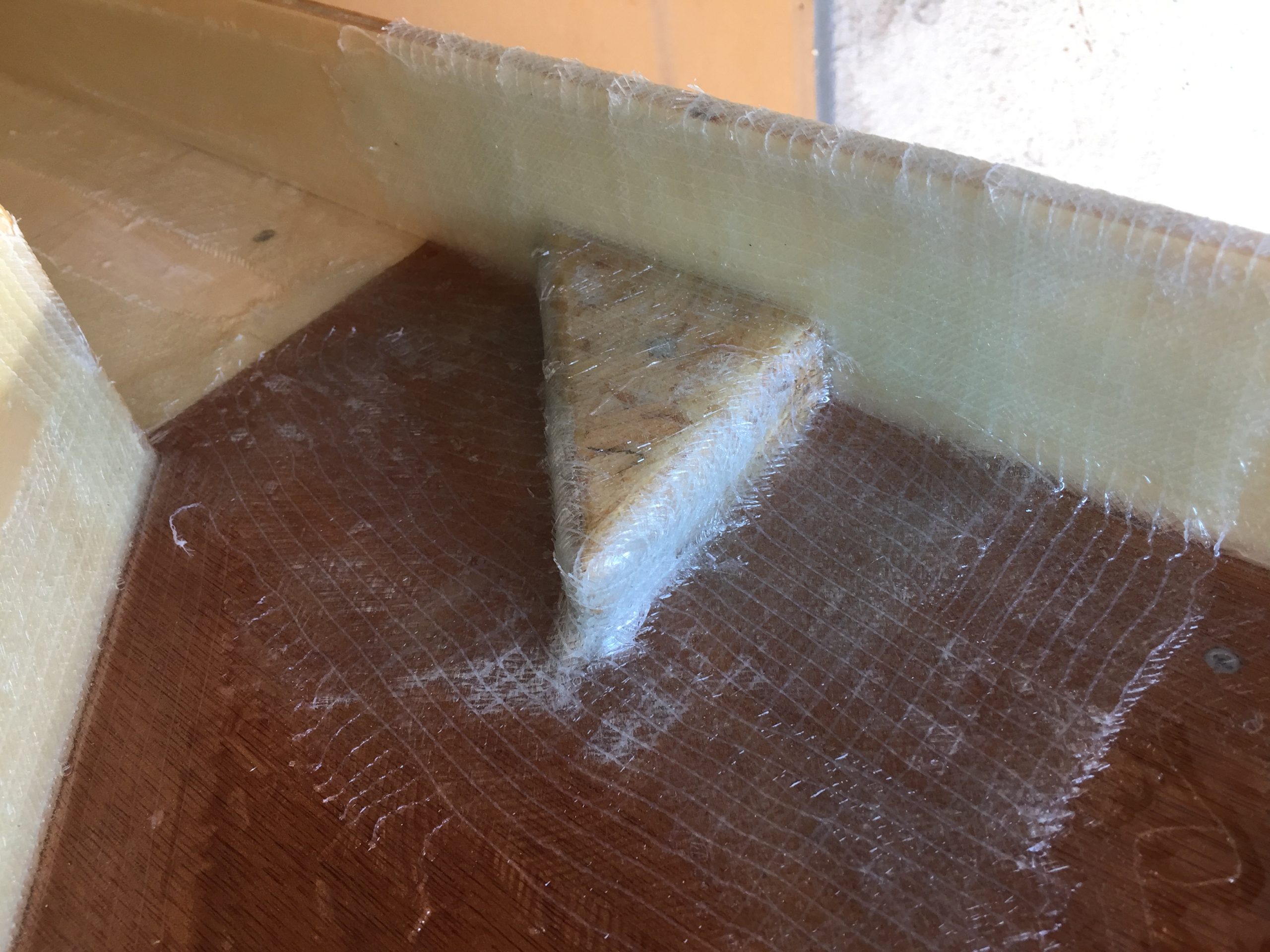 Die Wanne soll mit GFK (Glasfaser Kunststoff) beschichtet werden, damit das Holz nicht mit dem Wasser in Berührung kommt. GFK war für mich eine Premiere. Wenn man Videos darüber anschaut, sieht es Kinderleicht aus. In der Realität kenne ich kein Material, das sich so besch…en verarbeiten lässt. Da braucht man Nerven aus Kruppstahl … gehärtet.