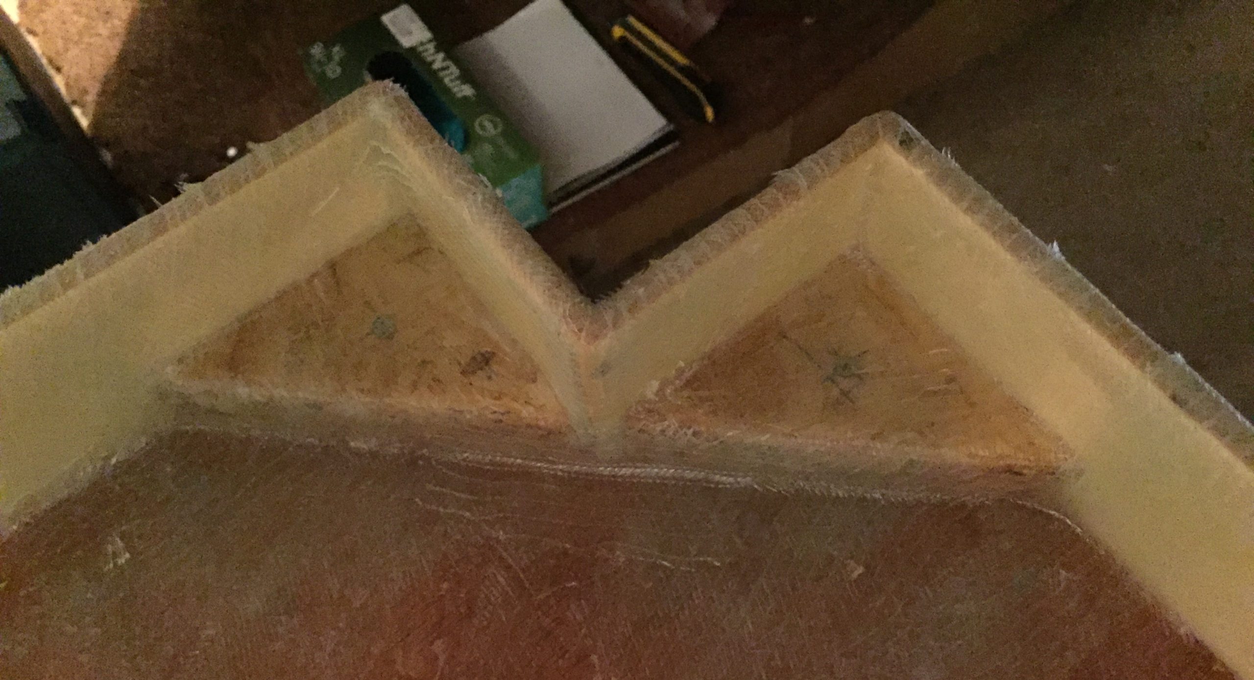 Nachdem die Ecken und Kanten alle mit mindestens 3 Lagen Glasfasermatte versehen sind, kommen die Flächen dran.