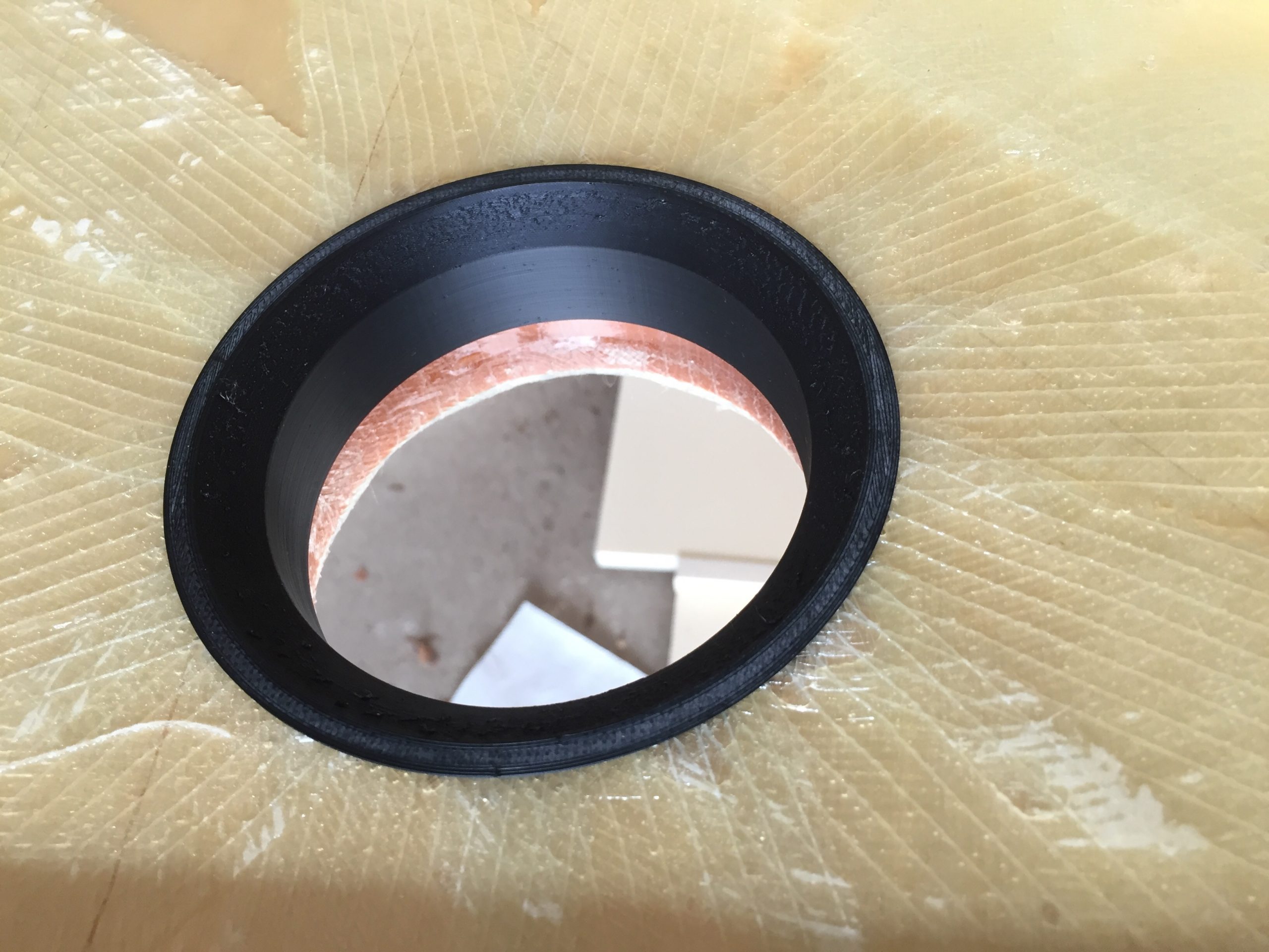 So trägt man immer wieder Schicht für Schicht auf. Man könnte auch direkt Geldscheine aufkleben. Um später ein schönes passgenaues Loch für den Siebeinsatz zu haben, habe ich Einsätze aus ABS gedruckt.