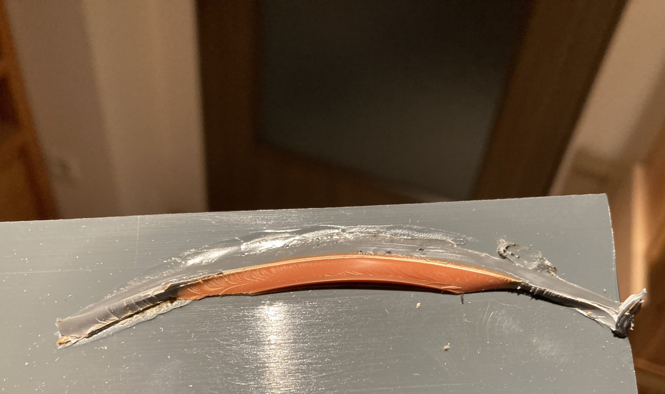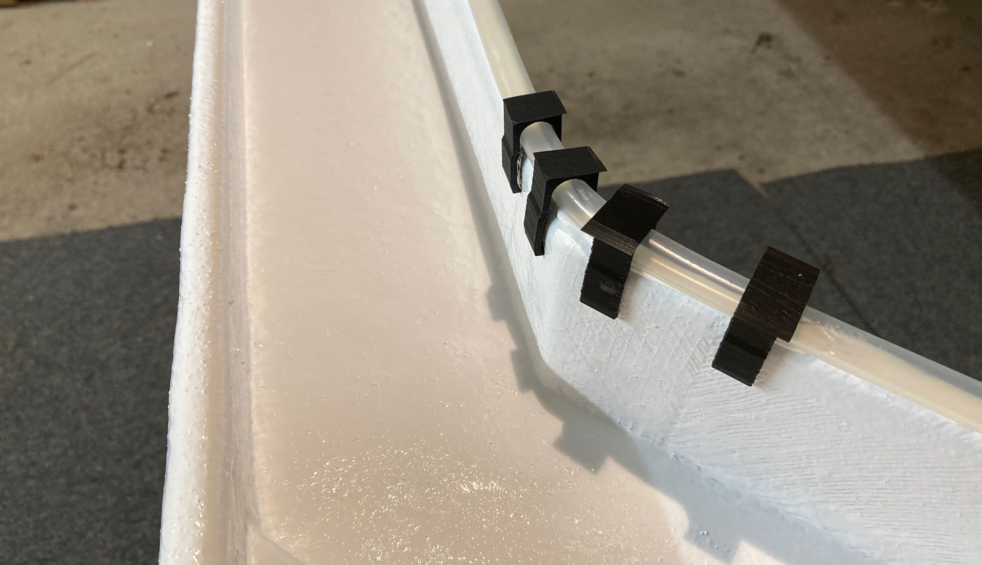 Nachdem der Lack eine Wochen Zeit hatte auszuhärten, ging es mit der Dichtung weiter. Ich will „vorsichtshalber“ die Ablaufrinne zur Edelstahlwanne hin abdichten, falls mal mehr Wasser aus dem Pool schwappt „Flachköpper“ als die Rinne aufnehmen kann. Dazu habe ich mir einen 12mm Silikonschlauch gekauft. Zum verkleben habe ich mir, ohne darüber nachzudenken, das gute, sündhaft teure Schimmelresistente Outdoor Schwimmbad Silikon gekauft. Dann hat mich so ein Schlaumeier darüber aufgeklärt, das man Silikon nicht mit Silikon verkleben kann. Also schnell einen Test gemacht. Die Aussage die man auch haufenweise im Internet findet, ist völlig falsch. Zumindest bei meinem Silikon. Hält bombe. Also wie bekomme ich den Schlauch auf der Kante fixiert. Meine erste Idee waren Zwickel. Diese sind leider viel zu klein. Dann muss es der 3D-Drucker richten.