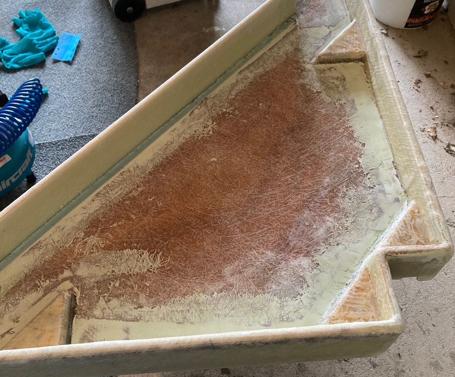 Aus diesem Grunde habe ich hier 3 Schichten Gelege a 400g/m² mit zwei Schichten Matte eingefasst. Das ergibt ca. 4mm Materialstärke und sollte somit robust genug sein. Nach dem Austrennen mit der Flex und dem verschleifen, kommt das Verspachteln und der PU-Decklack als Finish.