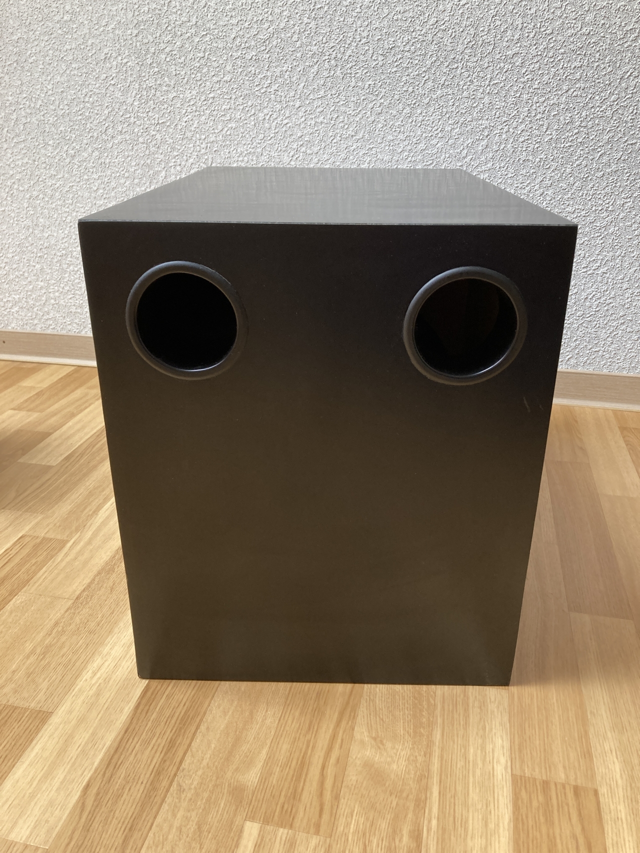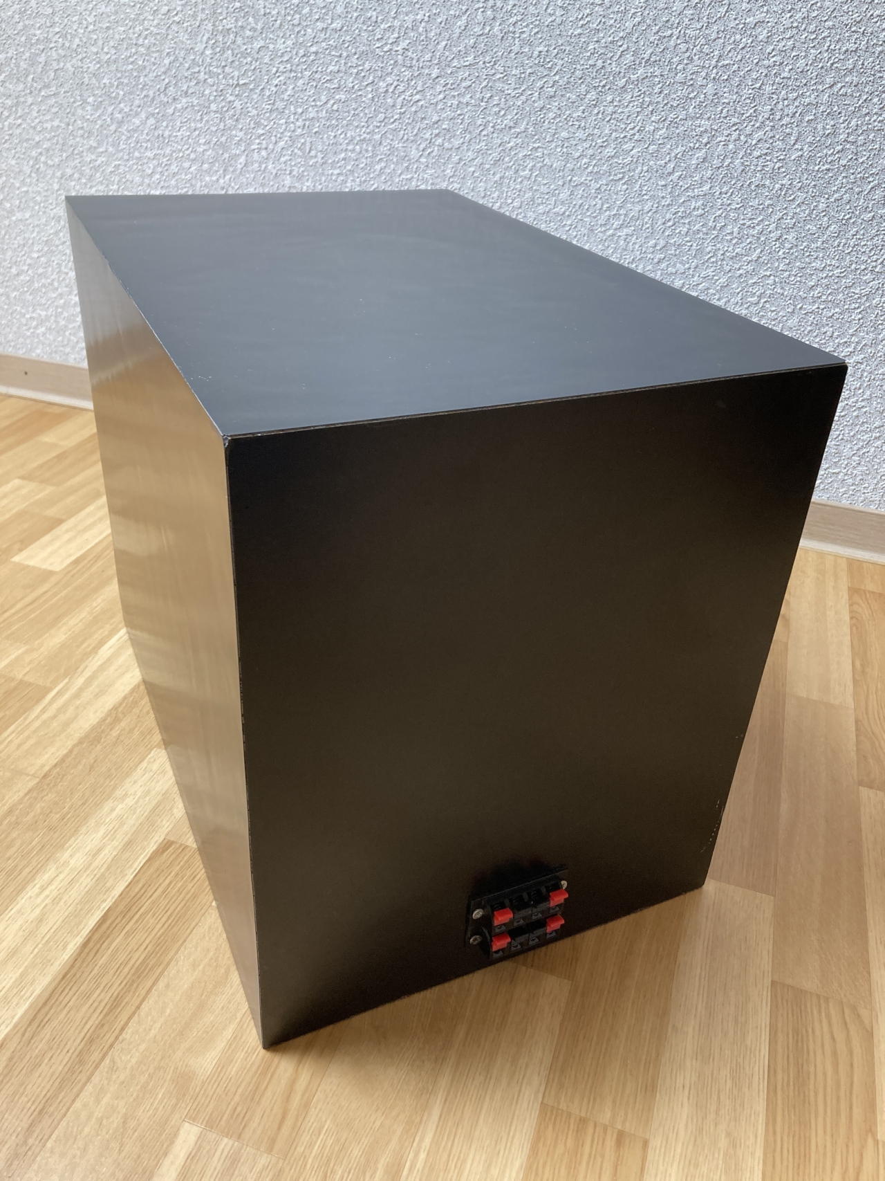 Beim Subwoofer habe ich ein beidseitig ventiliertes Bandpassgehäuse berechnet in dem die Bässe Push-Pull eingebaut sind. Zudem wird die zweite Kammer zur gleichen Seite ventiliert wie die erste. Das ergibt ein Minimum an benötigtem Kammervolumen.