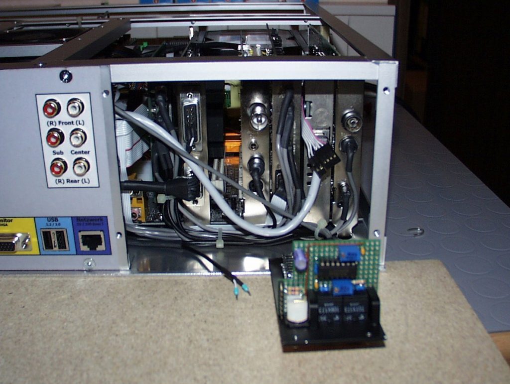 Im inneren tacktet ein Intel Core2 Duo E6850 mit 3.0 GHz und zwei Corsair 2GB DDR3 1333MHz Speicher im Dual Channel Betrieb. Wichtig ist noch die XFX GeForce 7600 GS Grafikkarte. Zum einen kann erst die Generation 7 das volle Spektrum an HD-Audio über den HDMI 1.3 ausgeben. Zum anderen ist die 7600 GS passiv gekühlt, was für die Geräusche wichtig ist. Als Zusatzkarte kommt lediglich die TV Karte HAUPPAUGE WINTV NOVA-CI-S SE DVB-S und dazu die CI-Modul Erweiterung HAUPPAUGE NOVA CI zum Einsatz. Das nötige AlphaCrypt CI-Modul und die passende Premierekarte ist auch bereit.